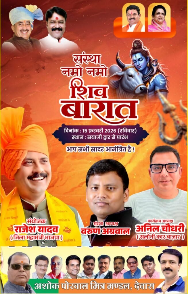 देवास। संस्था नमो-नमो द्वारा इस वर्ष महाशिवरात्रि के पावन अवसर पर लगातार 13 वे वर्ष में भी भव्य एवं अनूठी शिव बारात का आयोजन किया जा रहा है। शिव बारात रविवार, 15 फरवरी को सायं 5 बजे सयाजी द्वार से प्रारंभ होगी। संस्था संयोजक राजेश यादव एवं अध्यक्ष वरुण अग्रवाल ने बताया कि इस वर्ष की शिव बारात को विशेष रूप से आकर्षक एवं भव्य रूप दिया गया है। देश के विभिन्न राज्यों से कलाकार इसमें शामिल होंगे। केरल की प्रसिद्ध ढोल पार्टी, गुजरात की महिलाओं की डमरू पार्टी, उत्तर प्रदेश की सजीव झांकियां, रतलाम की चलित झांकियां तथा बेरसिया के कलाकारों द्वारा देवताओं की सजीव झांकियां मुख्य आकर्षण रहेंगी। शिव बारात में भगवान भोलेनाथ नंदी पर सवार होकर माता पार्वती को ब्याहने के लिए प्रस्थान करेंगे, जो श्रद्धालुओं के लिए विशेष आकर्षण का केंद्र रहेगा। इस अवसर पर देवास सांसद महेंद्र सिंह सोलंकी, जिलाध्यक्ष रायसिंह सेंधव, विधायक गायत्री राजे पंवार, पूर्व जिलाध्यक्ष राजीव जी खंडेलवाल, महापौर गीता दुर्गेश अग्रवाल, सभापति रवि जैन, पूर्व जिलाध्यक्ष बहादुर मुकाती, नंदकिशोर पाटीदार, पूर्व महापौर सुभाष शर्मा, शरद पचूनकर, कवि शशिकांत यादव एवं विश्वामित्र अवार्डी सुदेश सांगते विशेष अतिथि के रूप में उपस्थित रहेंगे। शिव बारात में अधिक से अधिक संख्या में श्रद्धालुओं से सहभागिता का आग्रह संस्था संचालक मंडल के सुमेरसिंह ठाकुर, संजय दायमा, नरेंद्र सोलंकी, दीपक सोनी, राकेश गुप्ता, महेश यादव, मनोज गर्ग, महेश चौहान, मनीष जैन, अजय तोमर, सुरेंद्र परिहार, अनिल चौधरी, बंटी मंगरोलिया, नितिन शेलके, नीलेश वर्मा, प्रवीण वर्मा, पंकज वर्मा, राम यादव, सोनू परमार, संजय ठाकुर, भूपेश ठाकुर, विकास जाट, गोपाल खत्री, राहुल गोस्वामी, शुभम जाधव, रोहित खिची (काली), रवि दायमा, रोहित शर्मा, मनीष काका, धीरेन्द्र दवे, लक्खा खत्री, गोलू पीओपी, राहुल ठाकुर, हेमंत कोदिया, दिनेश शर्मा, ईश्वर परसिया एवं शशांक पवैया, अशोक पोरवाल, गौरव दुबे,नीलेश पड़ियार,बंटी प्रजापत,अजय सेंधव,तनय चौधरी, सुरेंद्र गायकवाड़,अजय यादव,सुनील पंजवानी द्वारा किया गया है।